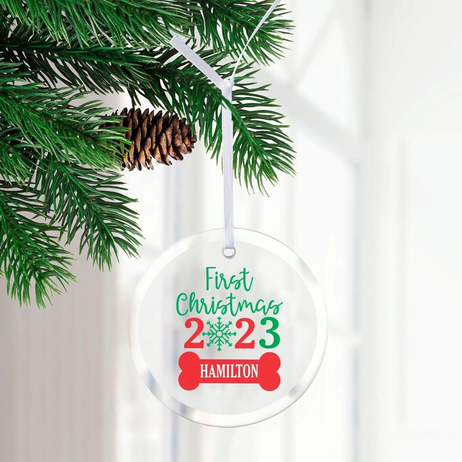 - From Frisco by Chewy. Customized, clear glass ornament includes a black velvet gift pouch.