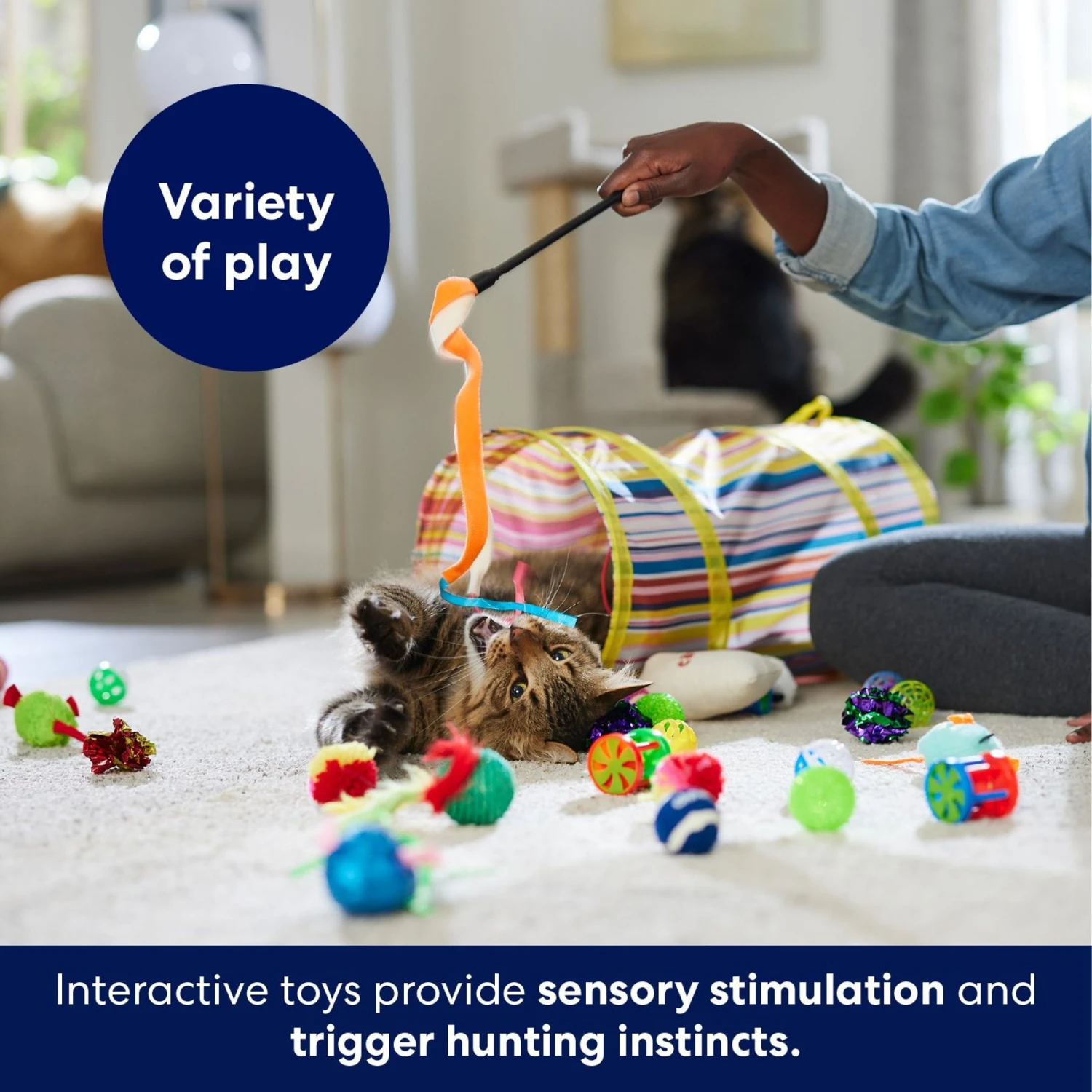 - This eclectic variety of over two dozen different play options features all the classics cats love, including catnip-filled toys, fuzzy mice, crinkly pom-poms, rolling balls, wand, and play tunnel.