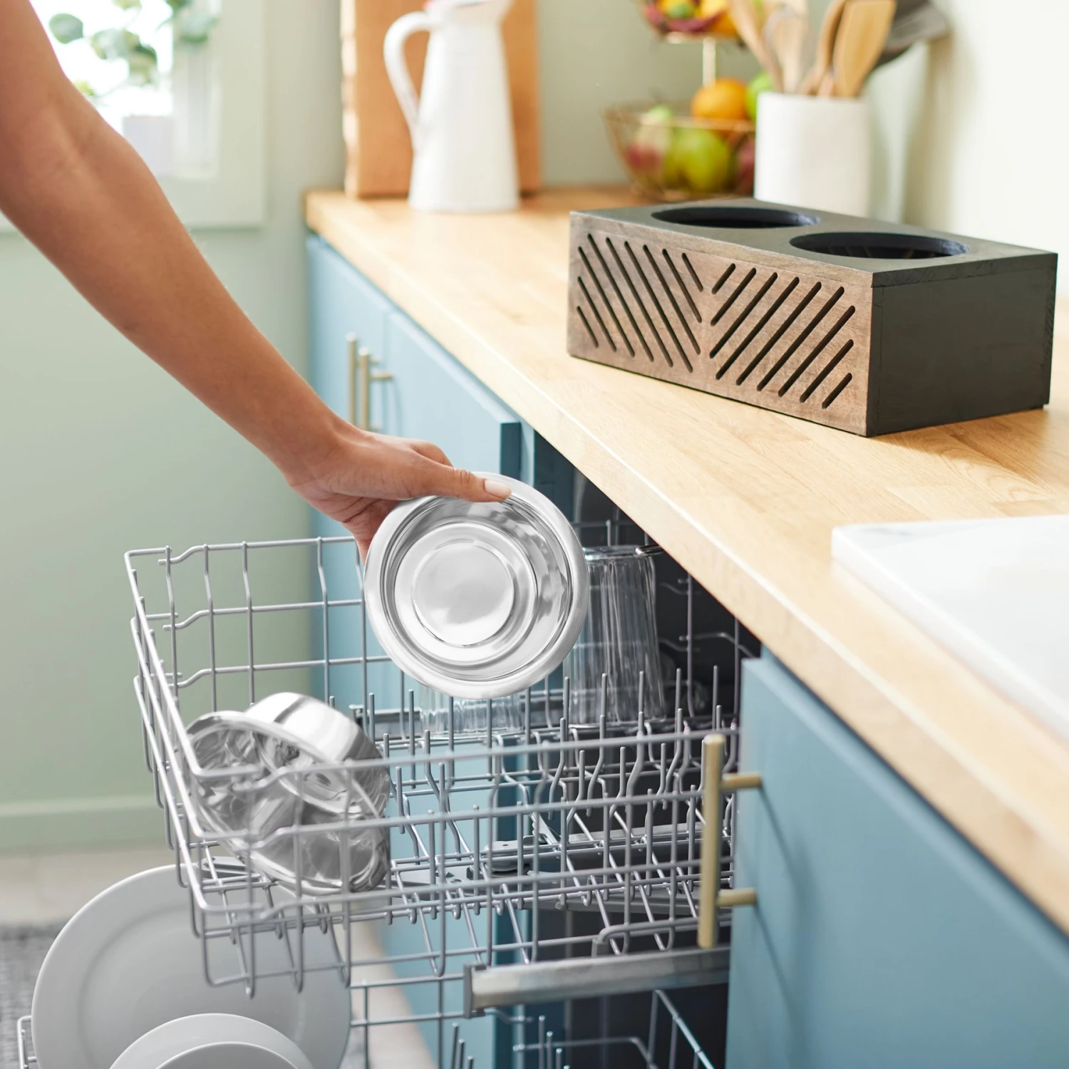 - Removeable stainless-steel bowls are dishwasher safe, making cleanup even easier.