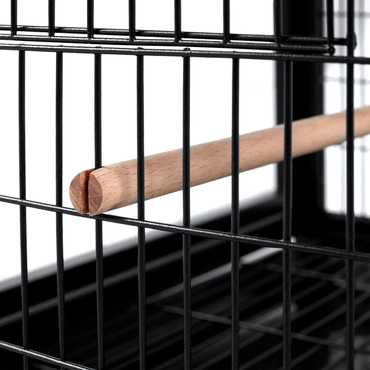 - Features iron construction with real beechwood and clear panels, allowing your bird a panoramic view of the environment.